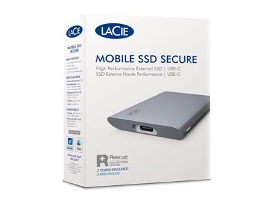 LaCie Mobile Secure STKH2000800 - SSD - High Performance - krypterat - 2 TB - extern (portabel) - USB 3.2 Gen 2 (USB-C kontakt) - 256 bitars AES - rymdgrå - med 3 års Seagate Rescue Data Recovery