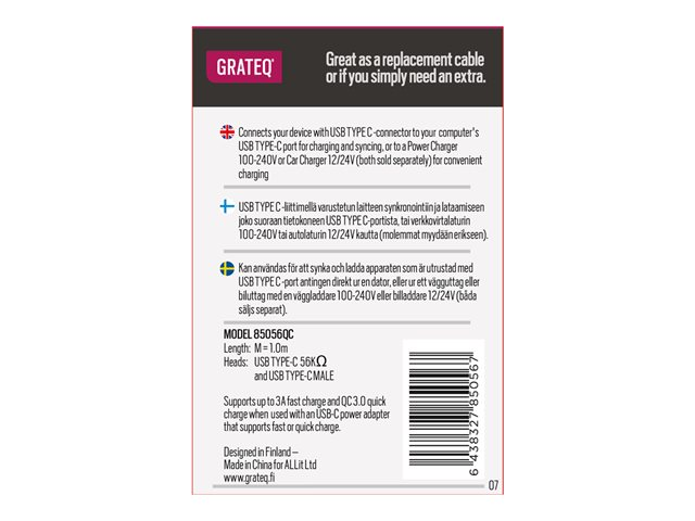 GRATEQ - USB-kabel - 24 pin USB-C (hane) till 24 pin USB-C (hane) - 5 A - 1 m - USB-strömförsörjning (100W) - vit