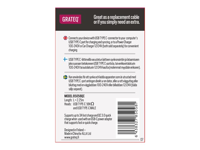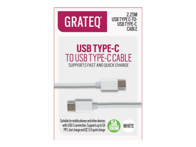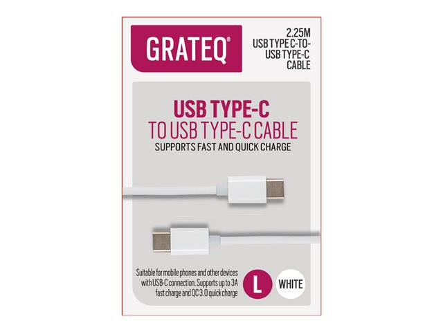 GRATEQ - USB-kabel - 24 pin USB-C (hane) till 24 pin USB-C (hane) - 5 A - 2.25 m - USB-strömförsörjning (100W) - vit