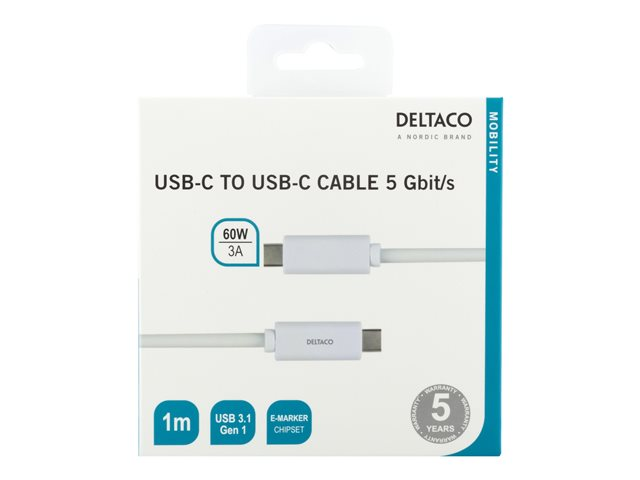 DELTACO - USB-kabel - 24 pin USB-C (hane) till 24 pin USB-C (hane) - 1 m - vit
