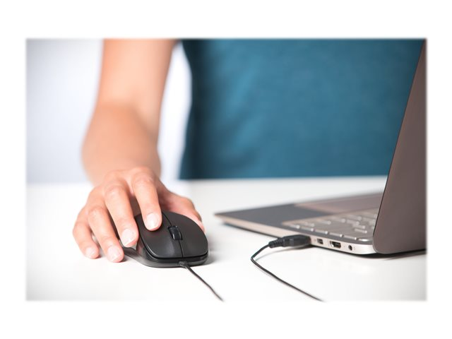Den trådade musen har tre knappar och skrollningshjul som ger tyst klickande när du behöver få jobbet gjort utan att störa andra i en tyst miljö. En högdefinitions optisk sensor ger pålitlig och responsiv styrning när du navigerar och den bekväma, konturerade formen är behaglig för både höger- och vänsterhänta användare. Den har plug-and-play-installation med en standard USB-anslutning och är byggd för att hålla med en 5-årig begränsad garanti.