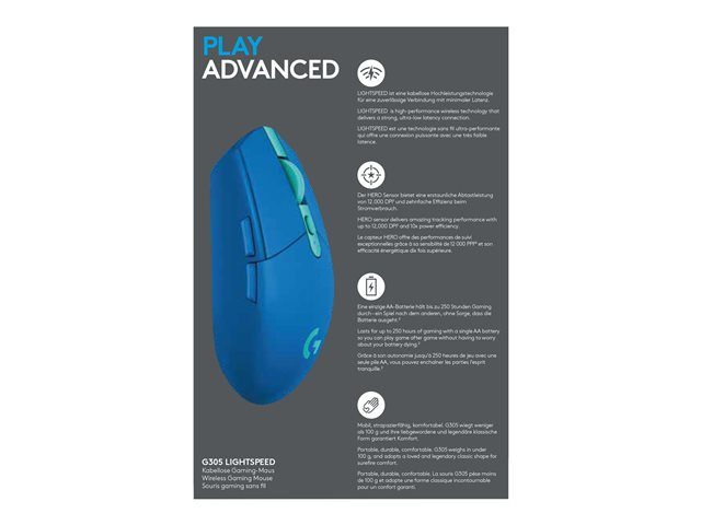 Logitech G G305 - Mus - optisk - 6 knappar - trådlös - 2.4 GHz - trådlös USB-mottagare - blå