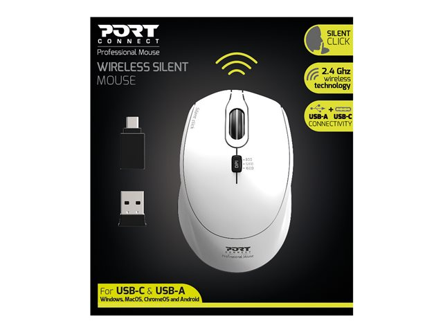 PORT Connect SILENT - Mus - optisk - trådlös - 2.4 GHz - USB/USB-C trådlösa mottagare - vit