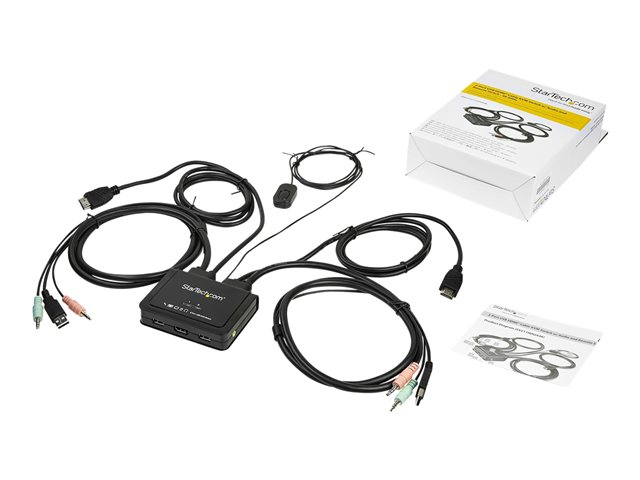 StarTech.com HDMI KVM-switch med 2 portar - 4K 60 Hz - Kompakt UHD/ultra HD USB KVM-switch för stationära datorer med dubbelport och inbyggda 1,2 m kablar samt audio - Bussdriven och fjärrswitchad - MacBook ThinkPad - Omkopplare för tangentbord/video/mus/ljud - 2 x KVM/ljud - 1 lokal användare - skrivbordsmodell