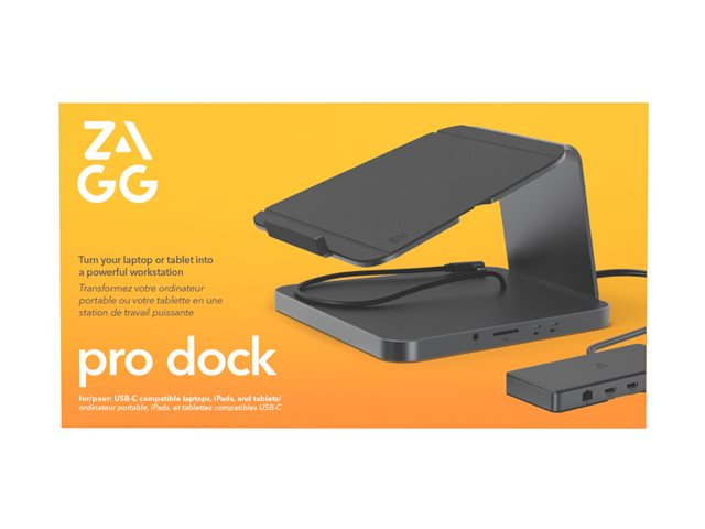 Skapa ett helt digitalt ekosystem med ZAGG Pro Dock. Stället håller din laptop eller surfplatta på plats, och de nio portarna gör det möjligt att ansluta USB-C- och USB-A-enheter samt extra skärmar, ethernet och ljudtillbehör. Den har till och med en SD-kortläsare för extra lagringsutrymme. Pro Dock ger dig dessutom tillgång till 150 W ström, så att du kan ladda dina anslutna enheter.