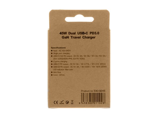 | Egenskaper | Laddar samtidigt upp till 2 enheter, GaN Technology |