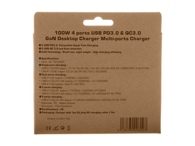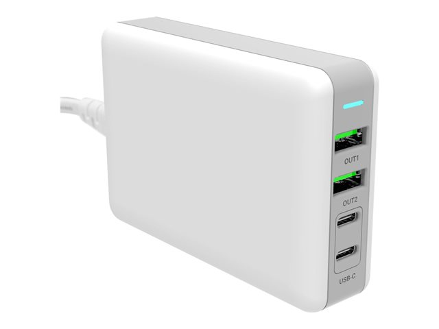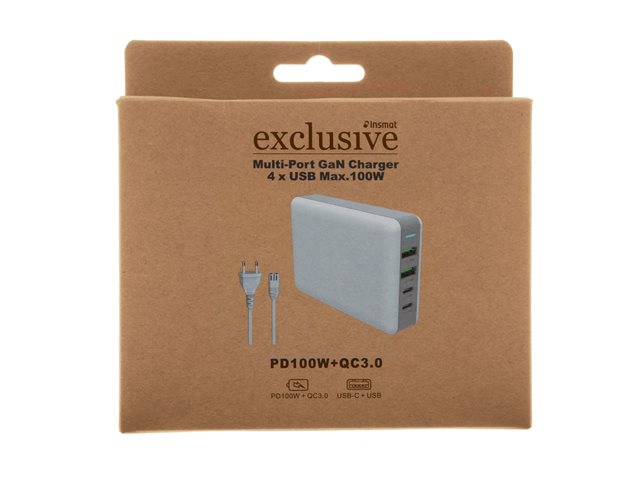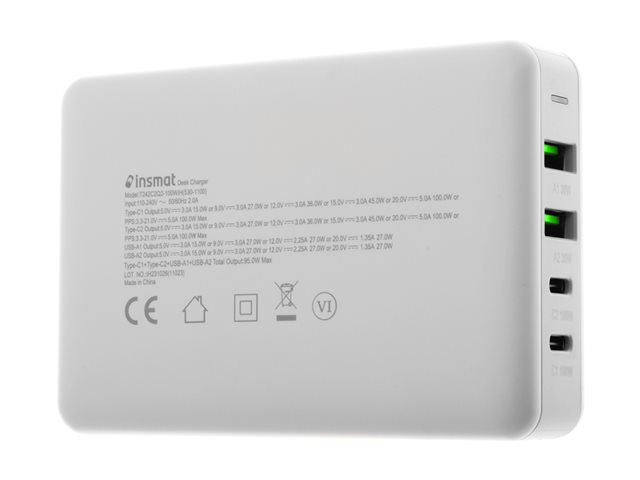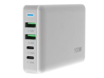 Insmat - Strömadapter - GaN - 100 Watt - 5 A - PD 3.0, QC 3.0 - 4 utdatakontakter (2 x 9-stifts USB typ A, 2 x USB-C) - vit